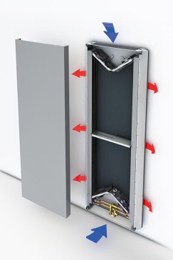 - wstępne złożona kaseta ścienna z pionowymi kratkami nawiewnymi po obu stronach grzejnika